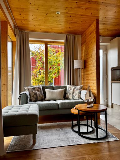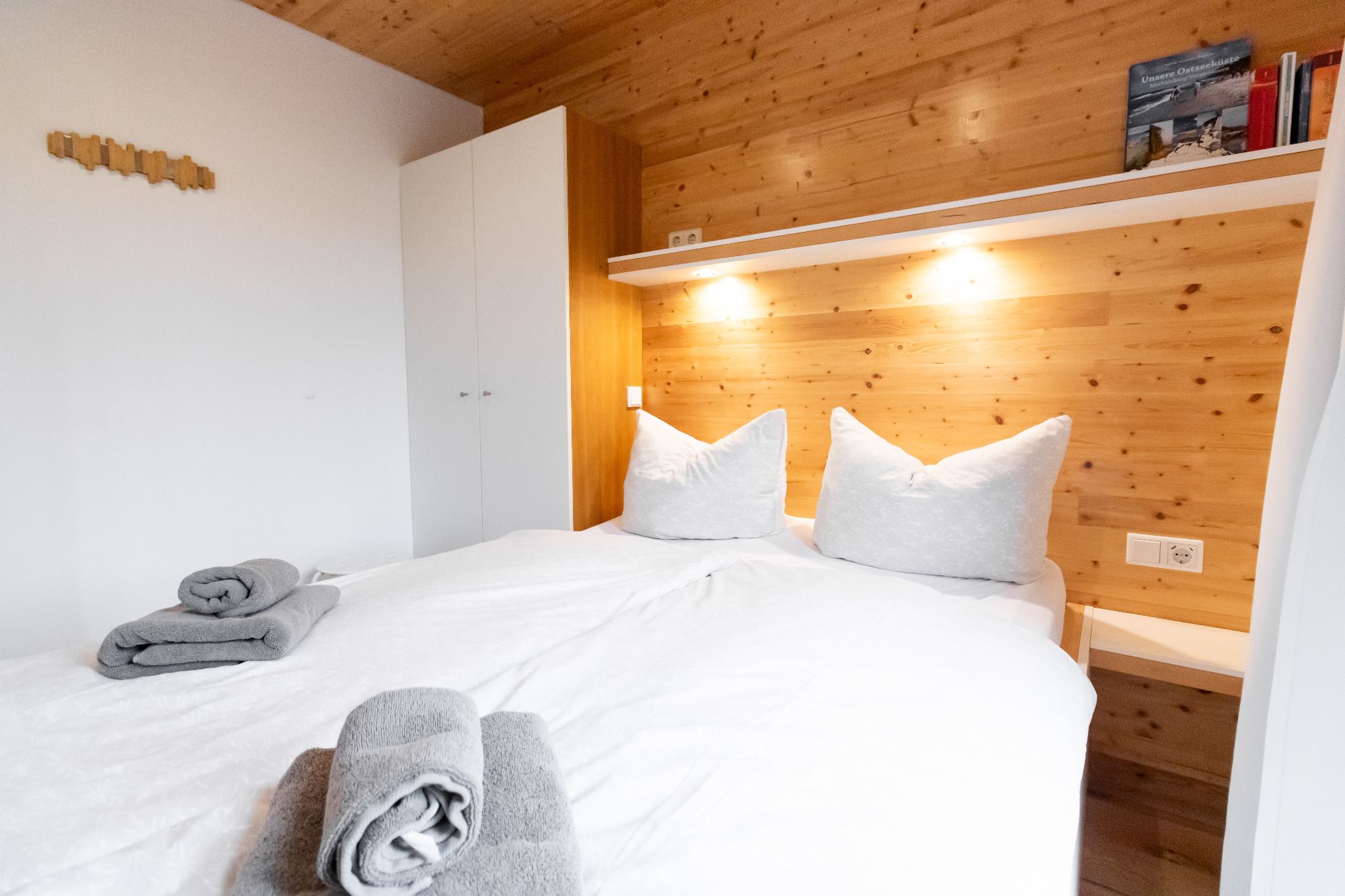 Wohnzimmer, Küche, Bad mit Dusche, Schlazimmer mit französischen Bett, Kinderzimmer mit Etagenbett